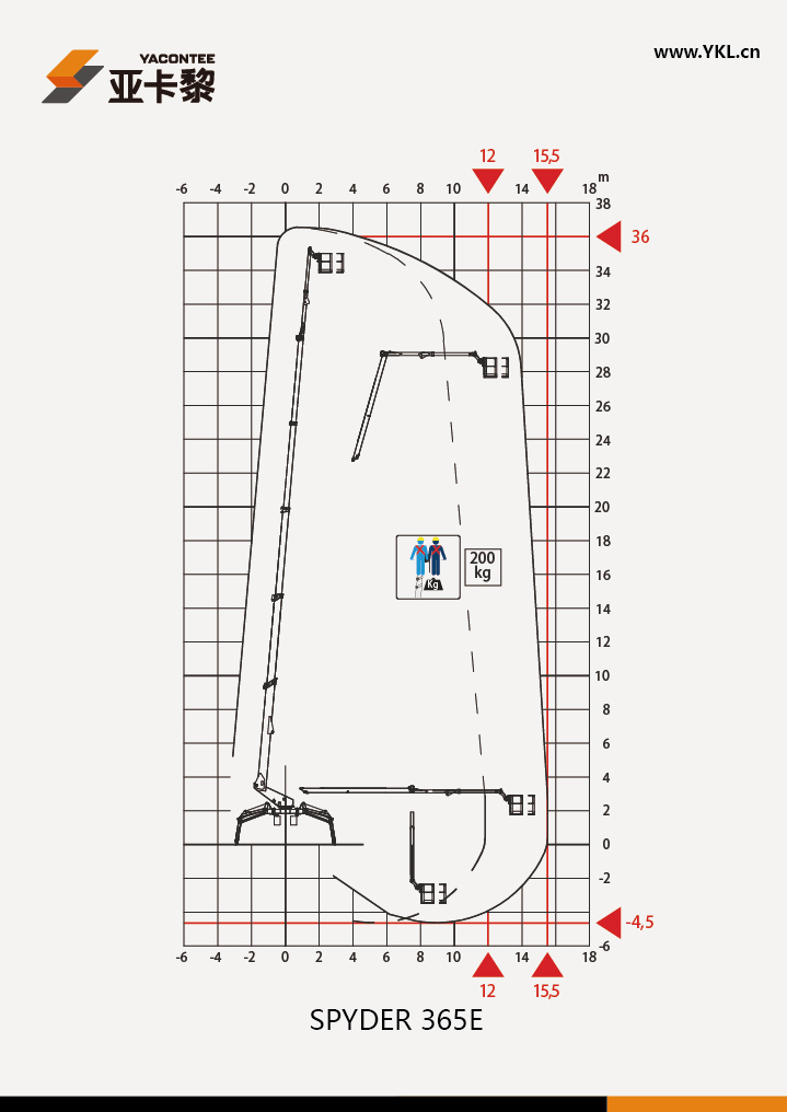 意大利思藍(lán)Cela公司生產(chǎn)的Spyder365型蜘蛛式平臺(tái)車采用重型底盤設(shè)計(jì),主要優(yōu)點(diǎn)就是堅(jiān)固耐用,安全可靠;此機(jī)器的作業(yè)高度為36.5米,水平延伸達(dá)到15.5米,在最長的水平延伸范圍內(nèi)承載能力為200公斤。
